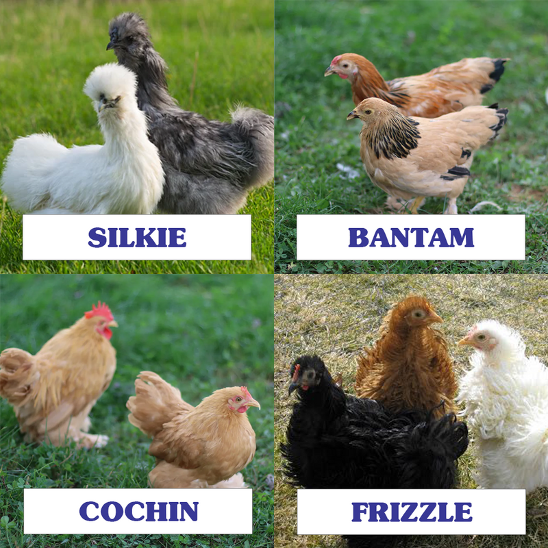 Mini, about ¼ the size of standard breeds with unique & varied feather patterns.
